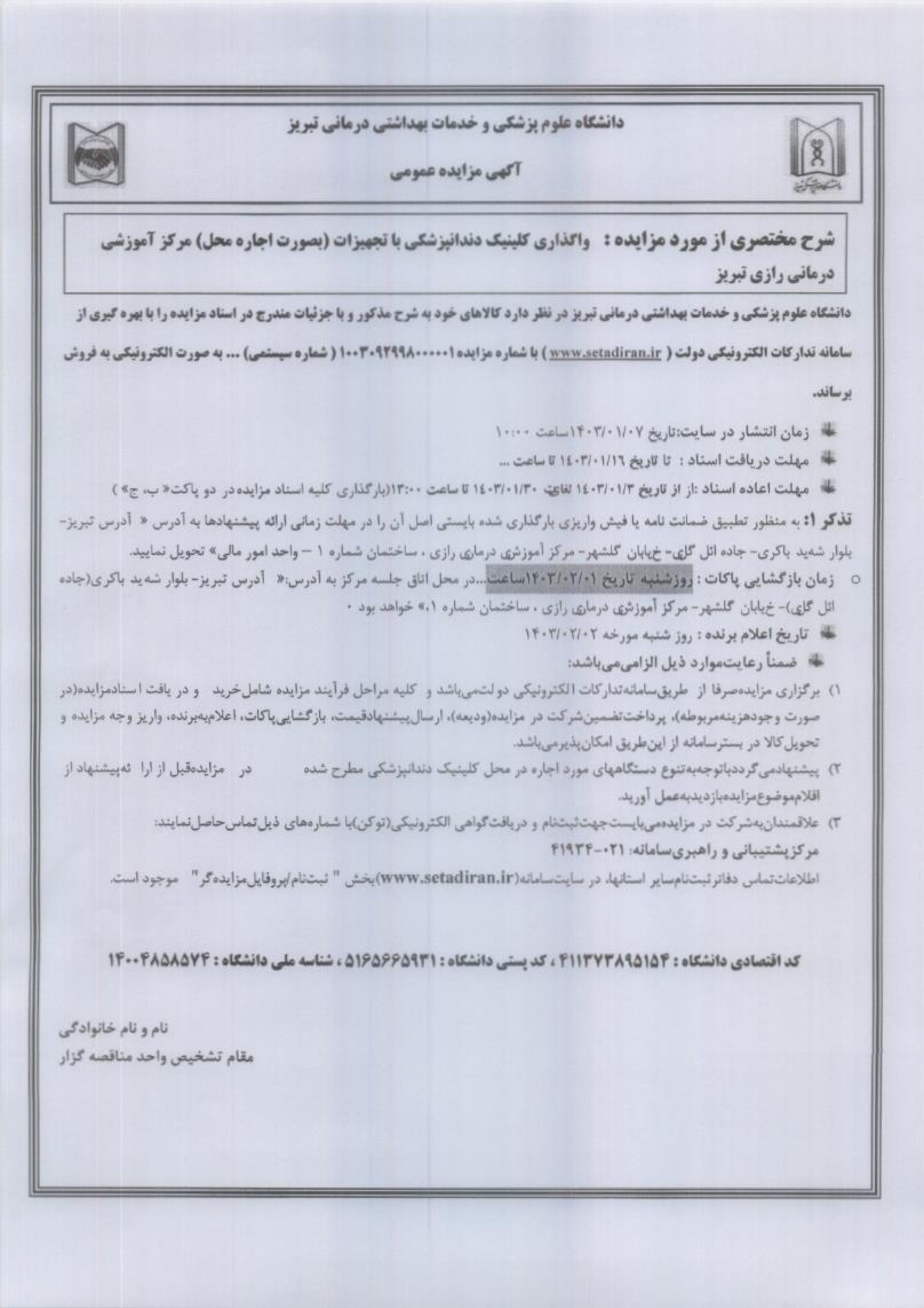 آگهی مزایده واگذاری کلینیک دندانپزشکی بیارستان رازی تبریز
