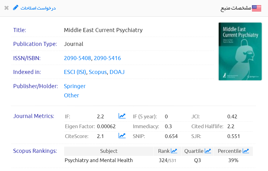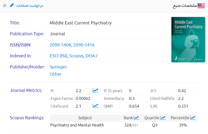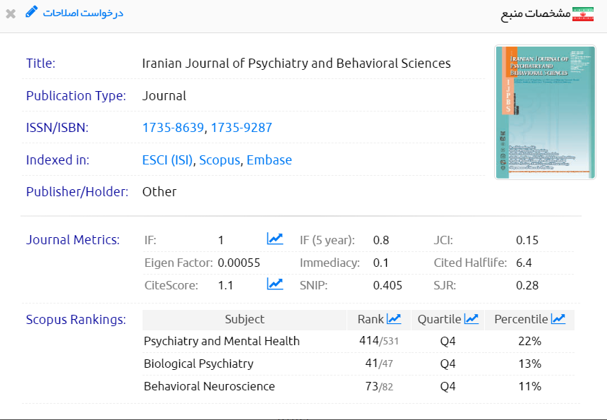 | 4 | Development of “The Safe Psychiatric Ward Batteryِِ | Original | ISI, PubMed , ScopuS | 19-Apr-22 | Image | |